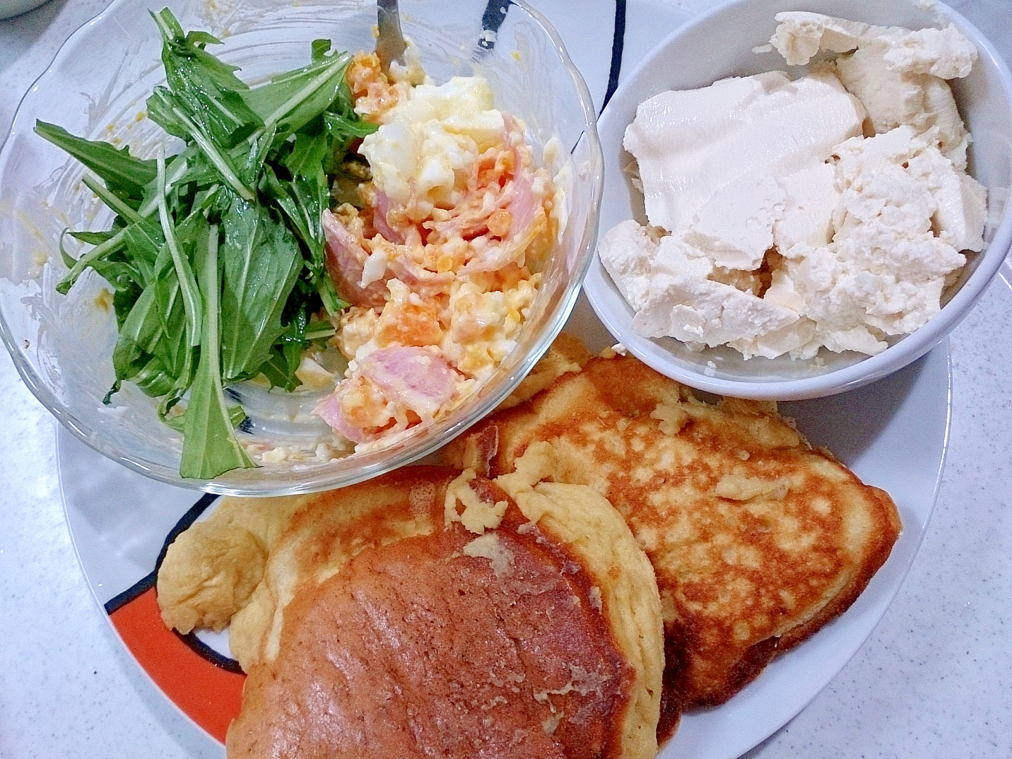 ワンプレート ヘルシーパンケーキと茹で卵ハムサラダ レシピ 作り方 By Hideok8 楽天レシピ